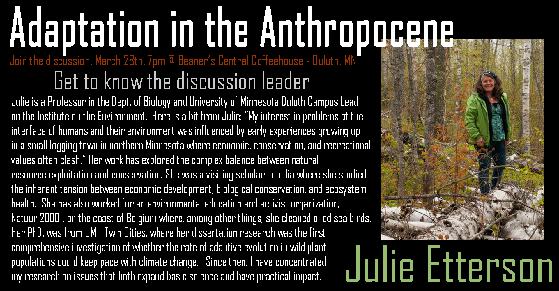 March, 2019: Julie Etterson, Adaptation in the Anthropocene, the resurrection is near!