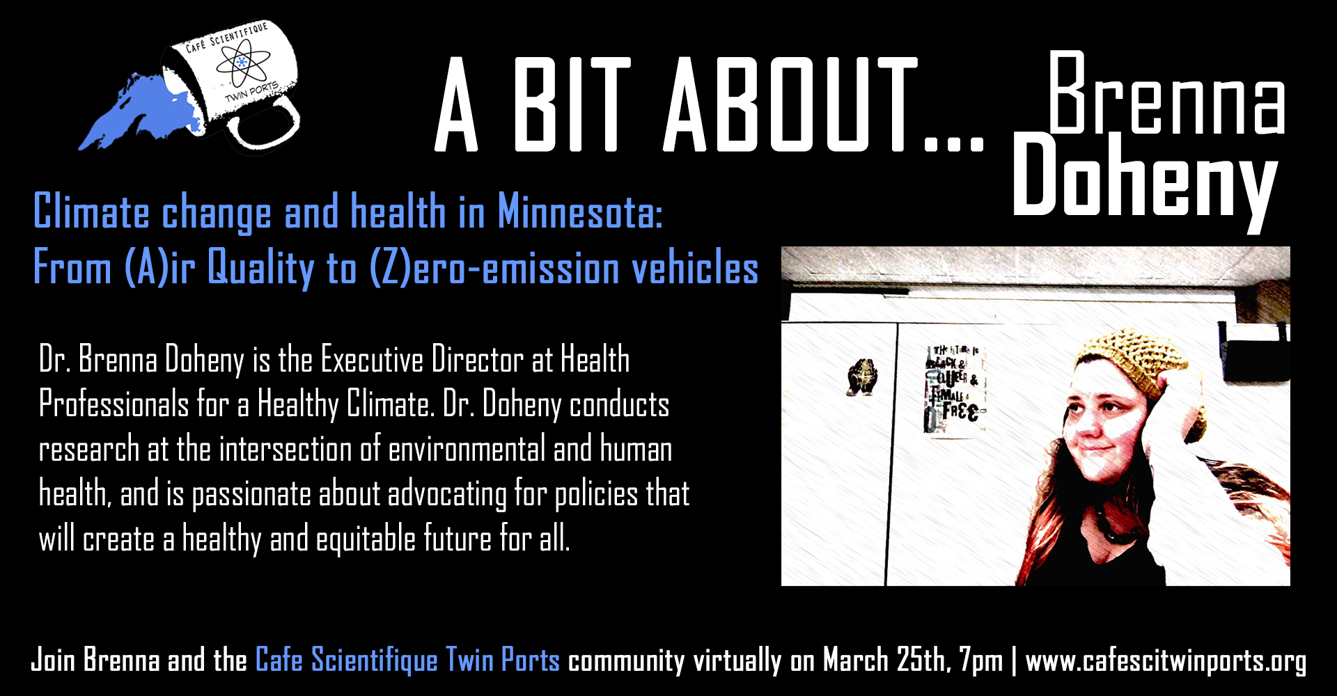 March, 2021: Brenna Doheny, Climate Change and Health in Minnesota: From (A)ir quality to (Z)ero-emission vehicles (Link to recording)