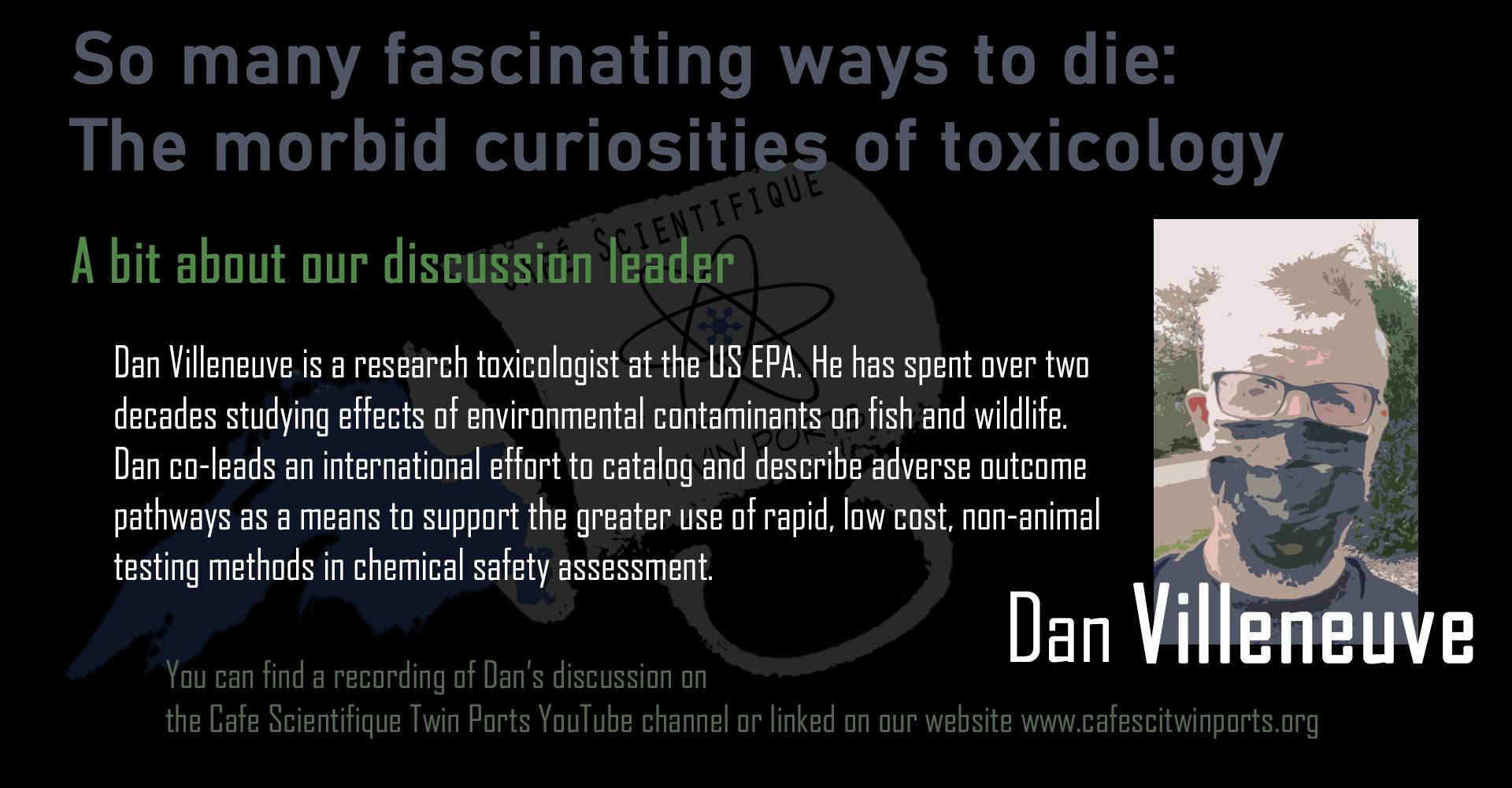 October, 2020: Dan Villeneuve, Cafe ScientifiEEK 2 – So many fascinating ways to die: The morbid curiosities of toxicology (Link to recording)