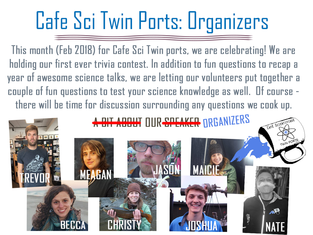 February, 2022: Twin Ports Science Celebration, Social, and Trivia, led by Nate Pollesch and Kleighton Smoniewski of Cafe Sci Twin Ports (Mar 3rd)